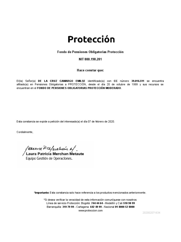 Estado de tu solicitud Envía tus certificados de pensionado a tu correo electrónico Envía tu Historia Laboral a tu correo electrónico. En el Certificado de afiliación Protección que otorga la administradora de fondos colombiana Protección solo se ofrece información básica como nombre completo del afiliado número de identificación del mismo el tipo de servicio al cual está suscrito el cliente y la fecha de expedición del documento. Certificado de Afiliación de Pensiones Obligatorias de Protección.